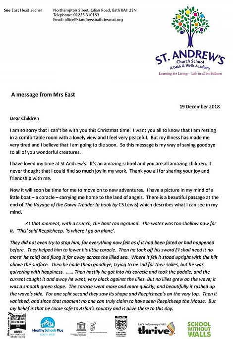 我在St Andrew's小學服務的日子過得很開心,很棒的小學有很棒的學生,我從來沒想過這一切會如此完美。我很感謝能夠當你們的朋友,感謝你們帶來的快樂。我很快就會展開新的旅程,此刻腦海裡想到的就是我在一艘船上,正在往天使國的方向前進。或許你們也可以為我畫一張這樣的圖畫送給我。」