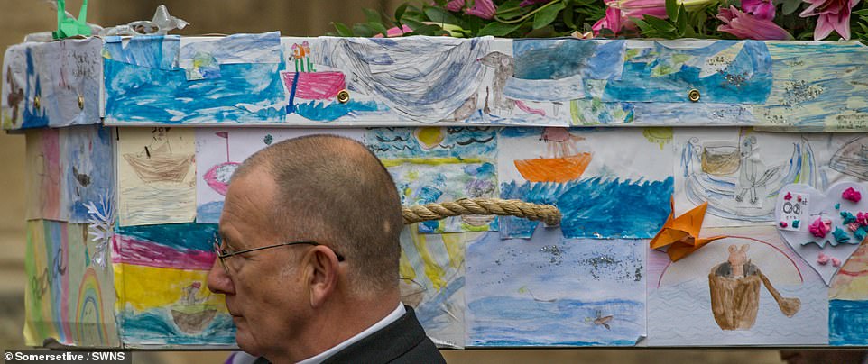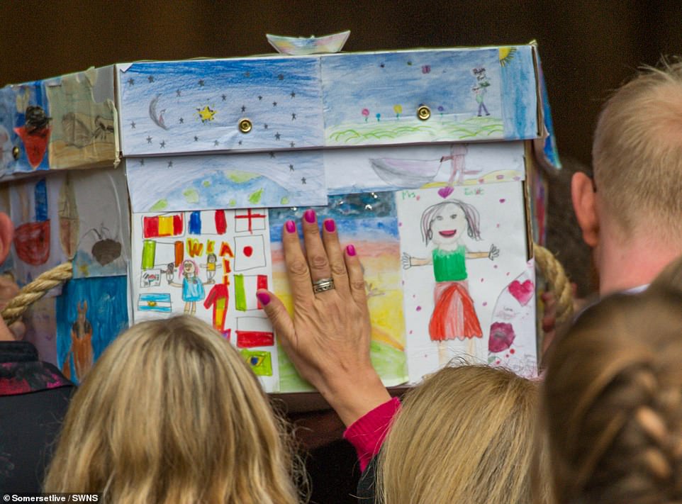 ▼這些畫作也被貼在Sue的棺材上,讓現場的氣氛多了一點樂觀和希望,就像校長最想留給孩子們的東西一樣。