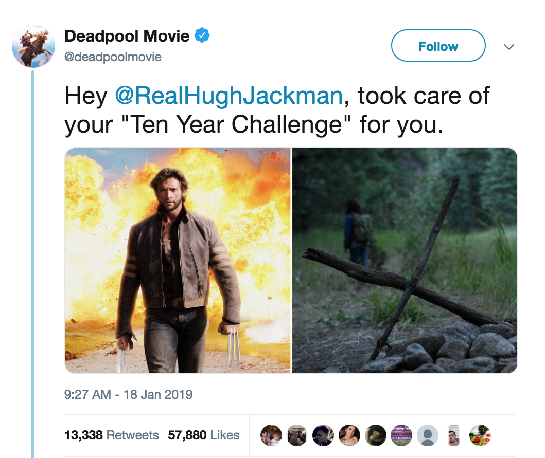 2019年01月19日嘴砲英雄「死侍」果然很會耍賤~最近網路上流行著「10年挑戰」,必須翻出10年前的自己和現在做對比,讓大家看到最明顯的變化。戲裡戲外都有死侍精神的萊恩雷諾斯當然沒放過這個機會,他馬上就選了金鋼狼來開玩笑…可是卻害網友們都想哭了啦~