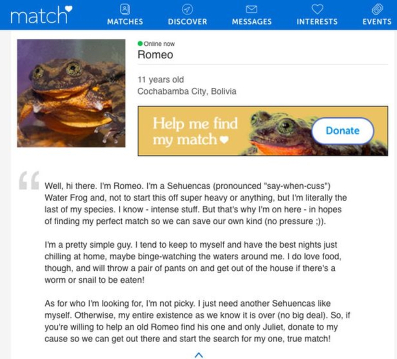 ▼瑟溫卡斯水蛙的壽命大約為15年,眼看Romeo一年一年孤單一蛙,科學家們非常揪心。去年情人節前夕,全球野生動物保育協會(Global Wildlife Conservation)與玻利維亞兩棲動物協會合作,在交友網站「Match.com」上為Romeo徵友,其實是想引發關注募集經費,用這筆錢去幫Romeo尋找另一半。