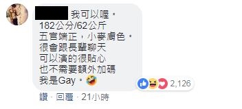 ▼此外最令網友瘋狂的就是以下的這些「額外福利」:「住宿:家、飯店 看臉分床分房間;地點:嘉義;動作:最多就抱抱,帥的話可以做;備註: 一旦被錄取之後,請一定要陪我走完這幾天,我總不可能今天跟明天的男友帶完全不一樣的吧,還有要弄假成真,請記住我不美別抱遐想;聯絡: 留言」。