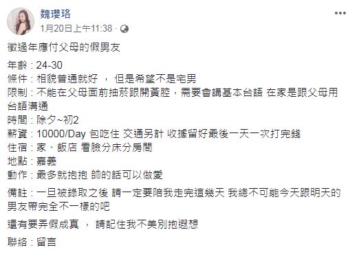 ▼女網友「魏瓔珞」在發文中列出了條件和價碼:「徵過年應付父母的假男友,年齡: 24-30;條件:相貌普通就好,但是希望不是宅男;限制:不能在父母面前吸菸跟開黃腔,需要會講基本台語 在家是跟父母用台語溝通、時間:除夕~初2;薪資 : 10000/Day,包吃住,交通另計,收據留好最後一天一次打完錢」。