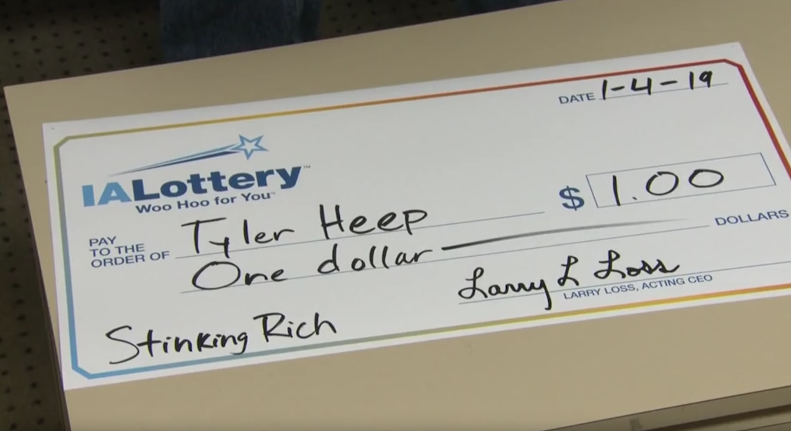 2019年01月23日只有中樂透大獎才能要求領取大支票拍照嗎?不,美國愛荷華州一名男子中的是數額超少的獎金,但是他卻大膽要求樂透總部允許他領取超級大支票,而且還接受媒體的拍照採訪…沒想到這個要求竟然被接受了!