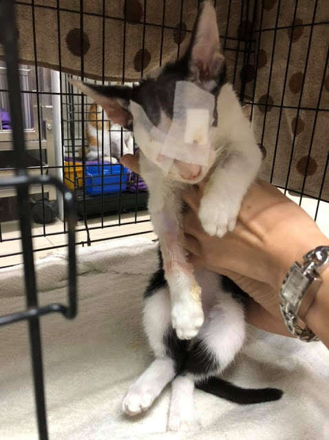 ▼小貓身體虛弱,連站起來都顫巍巍的,立刻做手術非常危險。獸醫們幫牠調理了3天,才通過手術徹底清理牠的眼窩,然後縫合。