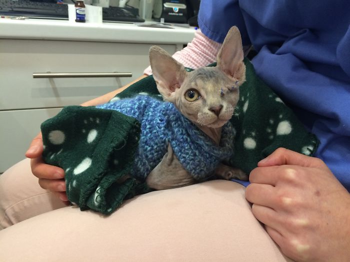 ▼獸醫覺得這隻貓咪很可憐,主動為牠治療。那時牠的傷勢太嚴重,眼睛已經保不住,只能移除眼球。