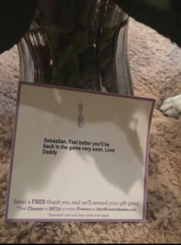 ▼但在讀了花束中隨附的卡片後才發現… 原來根本就是誤會一場!這束花其實是要送給Sebastian的啦!卡片上面寫著:「Sebastian,希望你早日康復,愛你的爸爸。」