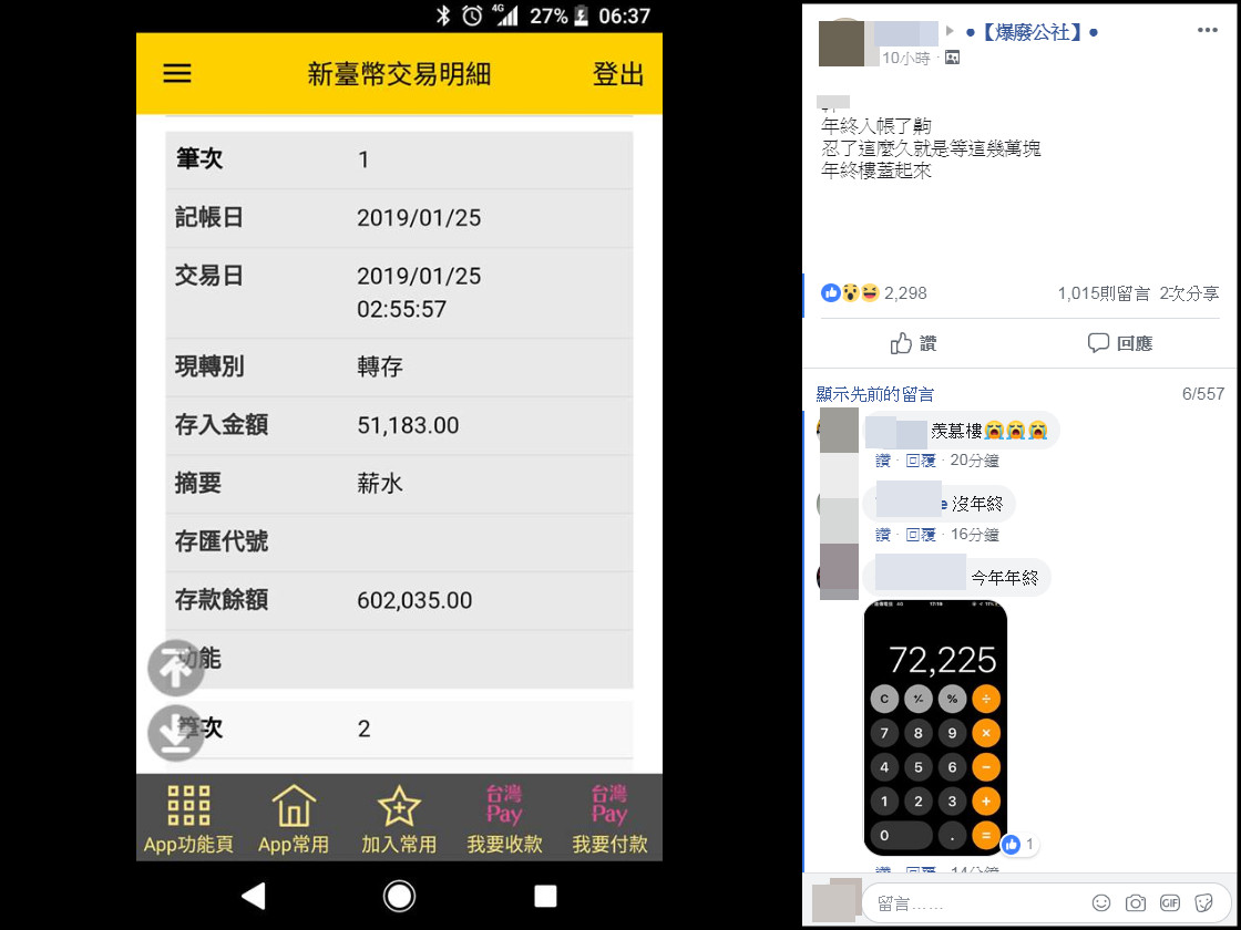 2019年01月26日又到了領年終的時候!一名男網友在臉書社團「爆廢公社」po出一張戶頭轉帳紀錄截圖,表示:「忍了這麼久就是等這幾萬塊,年終樓蓋起來!」從截圖中可以看到,他的戶頭中多了一筆51183元的年終。還有人注意到,他的存款餘額有60多萬,網友們大呼羨慕。