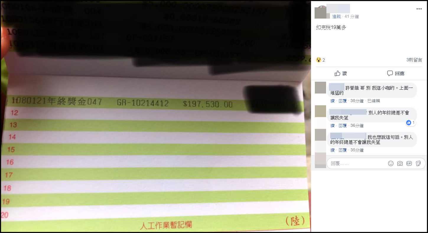 領到豐厚年終的人當然很開心,但也有人訴苦說:「我年終加尾牙中二獎,只有9000你敢信」、「我的工作是沒有年終,是鐘點制,2月收入更少,最不喜歡過年了」、「沒年終,沒尾牙,沒三節,只有勞健保」、「目前只能活在0的領域」。別人的薪水果然不會讓人失望啊~