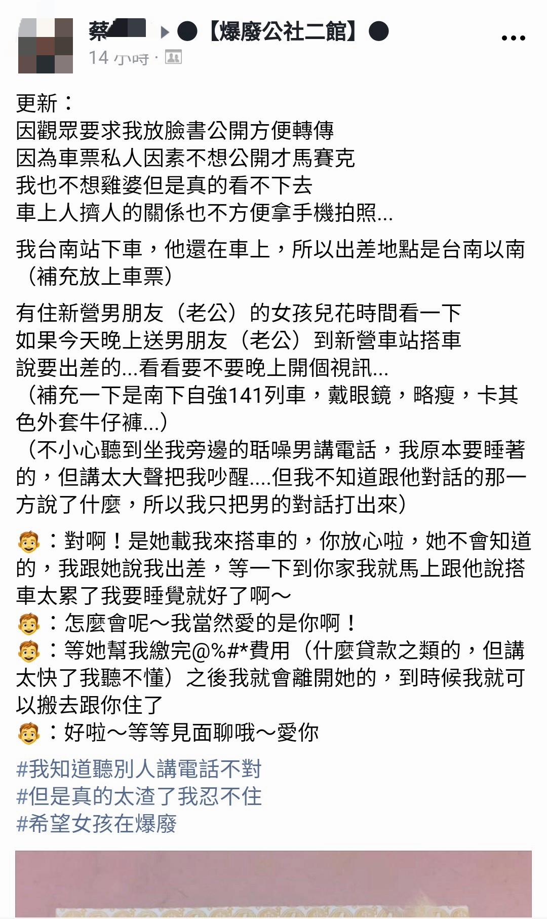 搭火車PO網揭露渣男行徑 網路力量大到女主角也看到:已放生了