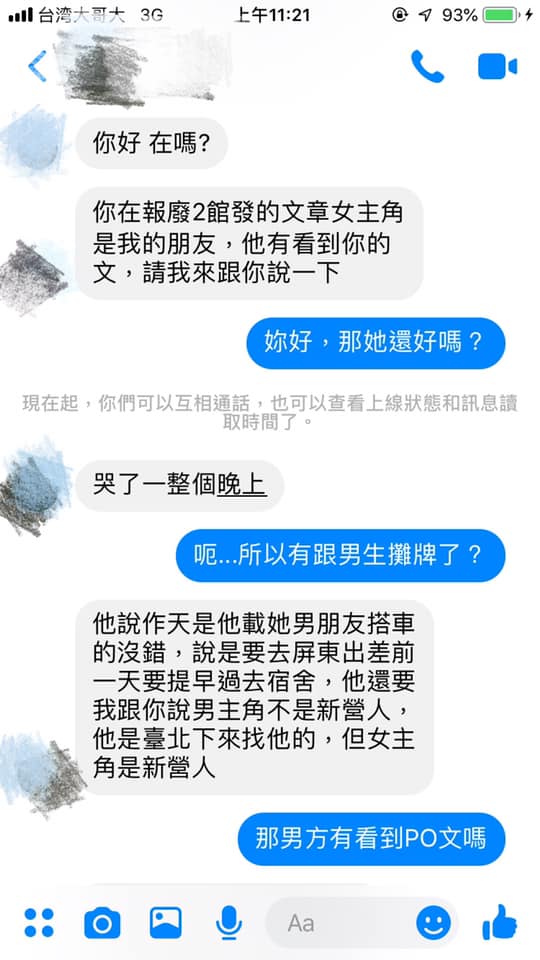 ▼原po也表示聽別人講電話是不對的,可是因為這段對話實在太渣了,讓她忍不住分享到網路上,還表示「希望女孩在爆廢」也能看到這段對話。到了隔天原po也更新了進度,原來事件女主角真的也看到了,還請朋友跟原po聯絡!以下是她們的對話內容: