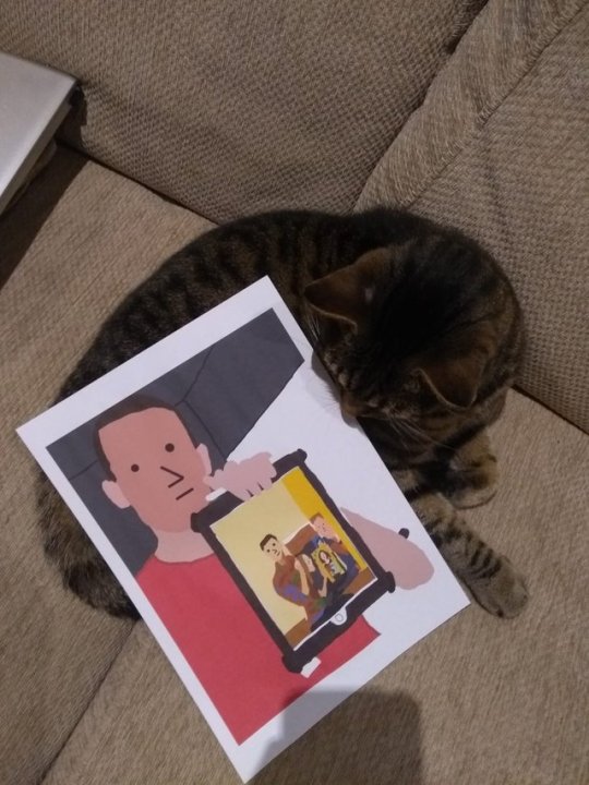 ▼男孩還調皮模仿了畫中男生的表情。