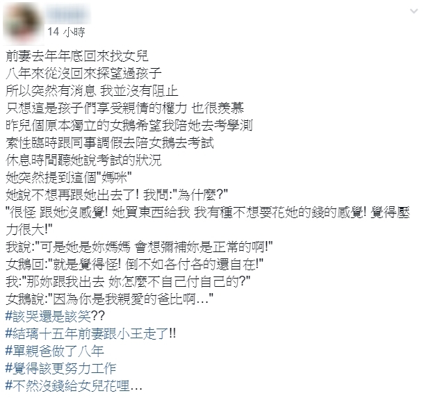 ▼原po也透露,前妻在離開的8年間,從來沒有探望過孩子,可是在去年年底卻突然回來說要找女兒。雖然心裡難受,可是為了讓孩子享受到親情的溫暖,他還是沒有阻止母女相聚。不過在她們相聚過後,原本個性獨立的女兒突然要求他陪考學測,就在考試的休息時間時,女兒對他說:「我不想再跟她出去了,很怪,跟她沒感覺!不想要花她的錢,感覺壓力很大!」