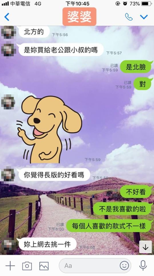 ▼而原po的婆婆也發現原po怕家人會冷,購買了名牌風衣給老公和小叔,卻沒有幫原po自己多買一件,因此主動表示「妳覺得長版的好看嗎?妳上網去挑一件」,要自掏腰包送一件給她!