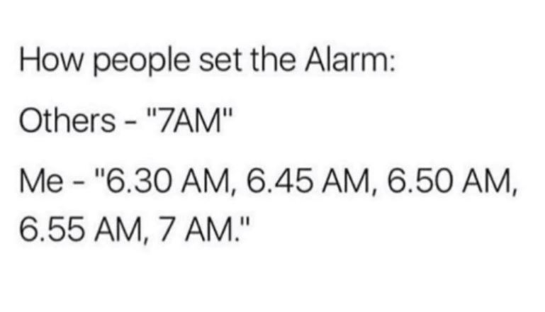 ▼一般人設定鬧鐘是「早上 7:00」;我卻是 「早上 6:30」、「早上 6:45」、「早上 6:50」、「早上 6:55」、「早上 7:00」。