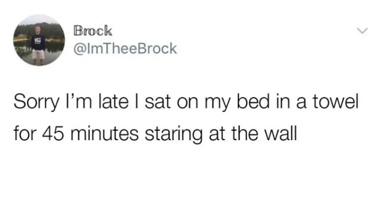 ▼對不起,我遲到了,因為我披著毛巾坐在床上,望著牆壁發呆了45分鐘。