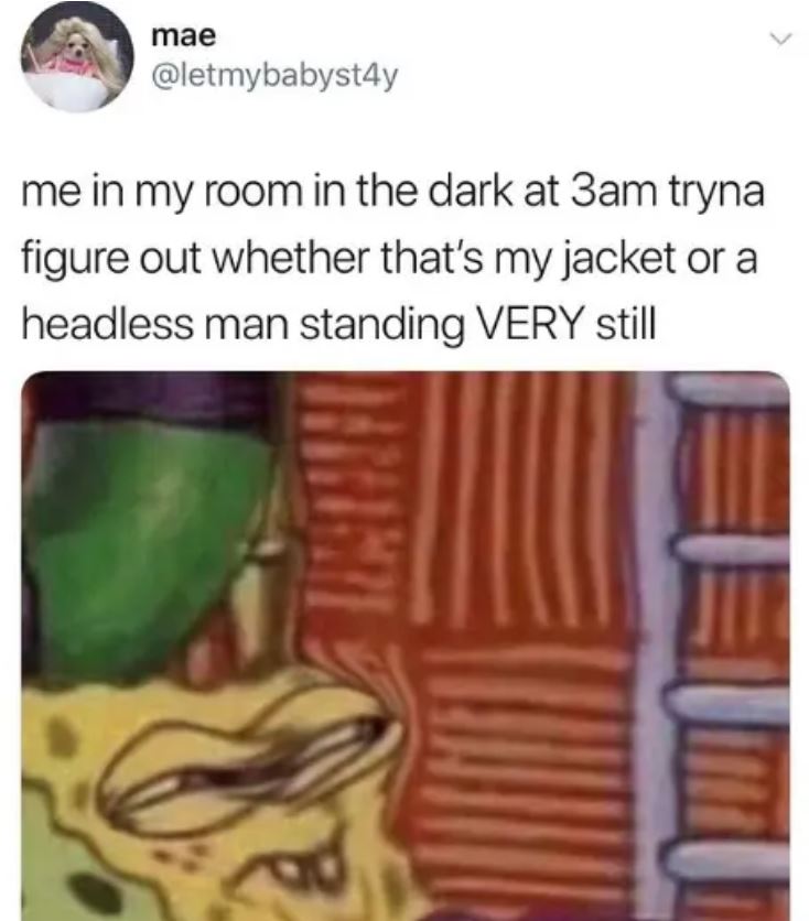▼當我在半夜3點突然驚醒時,開始疑惑不遠方的黑影是我的外套,還是有個沒有頭的男人站在那邊。