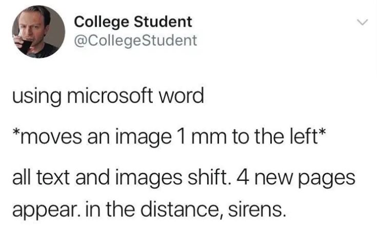 ▼使用微軟 Word 作報告時,將一張圖片往左邊移動一毫米,所有字型和圖片都亂掉了,還出現了4個新的頁面,明明就只移動了一點點。