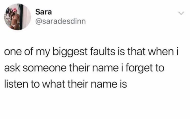 ▼我有一個很嚴重的缺點,就是當我詢問其他人叫什麼名字時,卻忘了聆聽他們的名字。