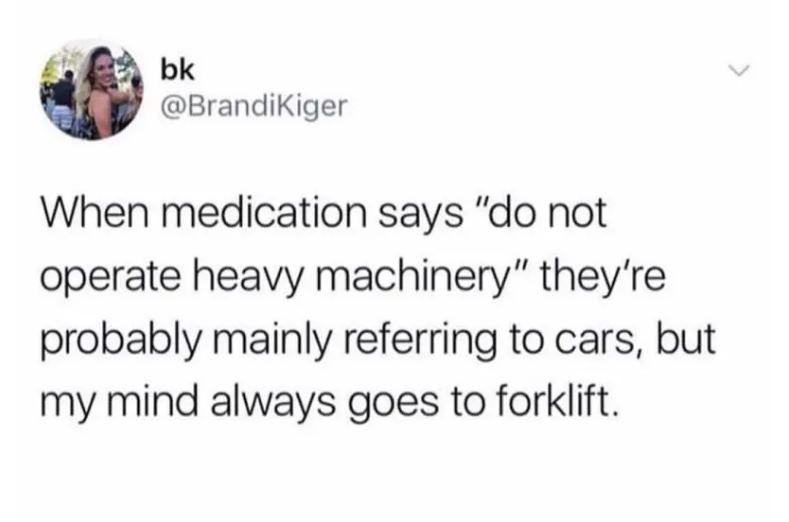 ▼當護理師叮囑「不要操作重型機器」時,一般人想到的可能是指開車,我的心裡卻一直想到堆高機。