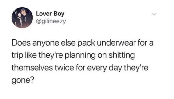 ▼大家在收拾行李時,會不會幫自己帶超多條內褲,仿佛到時一天會拉兩次在褲子裡一樣?