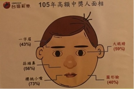 ▼至於得獎者的面相,在2016年的高額中獎人大多有這些特徵:圓形臉、一字眉、蒜頭鼻、大眼睛和櫻桃小嘴,而這種趨勢也在近幾年有所改變。