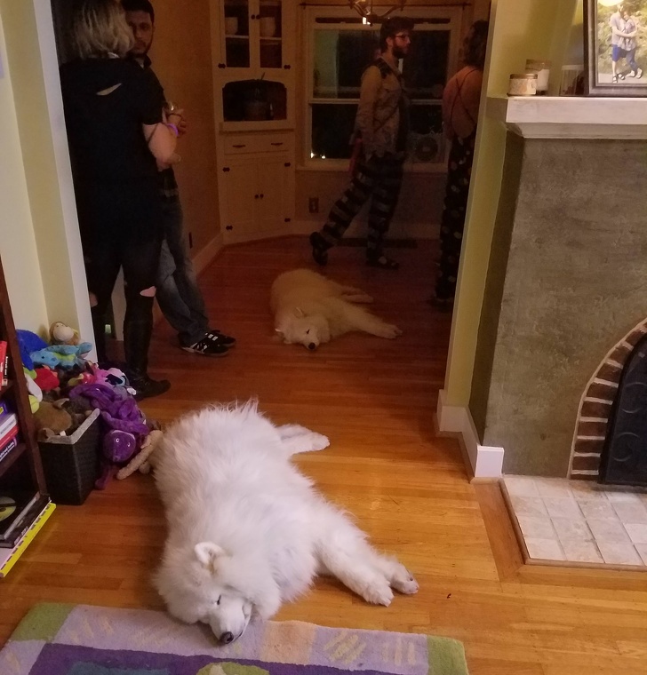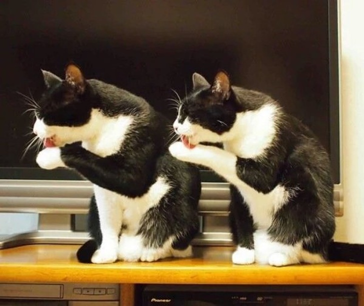 ▼兩隻狗狗仿佛在照鏡子般的同步!