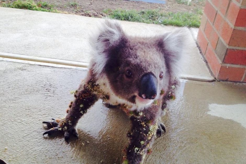 ▼生活在澳洲的Bruce Atkinson發現一隻無尾熊坐在自家門前,這個寶貝看上去有些不自在,渾身沾滿了植物的刺。
