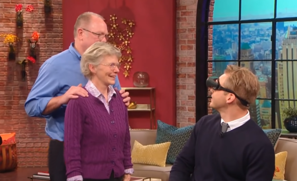 ▼柔伊寫信給一個幫助視障者恢復視力的節目《The Rachael Ray Show》,在那裡,他們為吉恩戴上了高科技眼鏡eSight,這種眼鏡能捕捉現實世界的高品質圖像,然後傳輸到佩戴者腦部,讓他們看清周圍的一切!