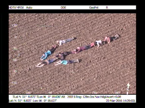 ▼下一秒小朋友們突然全部趴在地上,而直升機放大鏡頭一看…原來他們排出了箭頭圖示,引導著警察找那名追丟的的嫌犯!最後警察果然在箭頭方向的樹林裡看見嫌犯的身影!