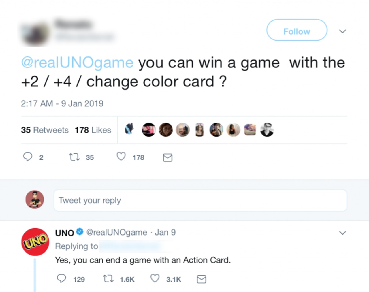 2019年02月08日經典紙牌遊戲「UNO」很多人都玩過,大家都期待大喊「UNO」的那一瞬間。很多人最不爽就是最後時刻手上卻拿著動作牌(Action Card」,導致必須重抽而無法結束回合。外國有玩家就忍不住在「UNO」官方推特發問,「到底動作牌可不可以用來結束回合?」。