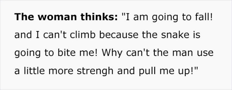 ▼女人覺得:「我快要墜崖了!有一條蛇在咬我,我沒辦法爬上去!為什麼他不能用點力氣,把我拉上去呢?!」