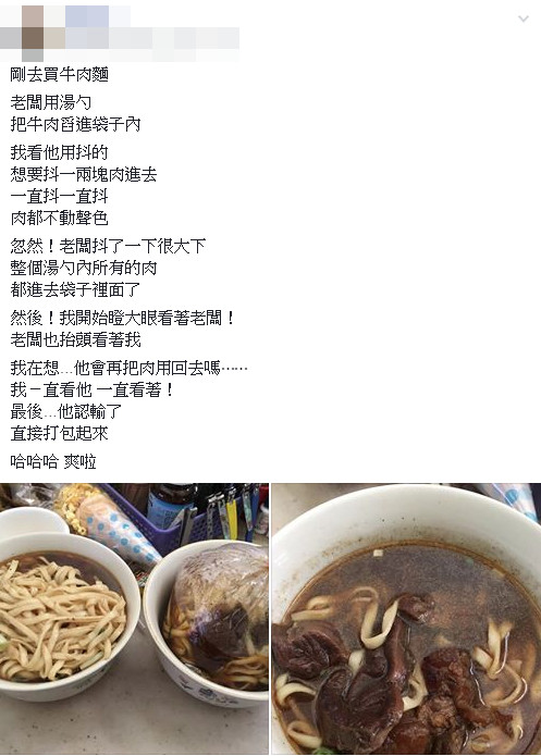▼網友在臉書社團表示,自己去買牛肉麵,老闆想用湯勺把牛肉裝到袋子內,但手一抖想放個一兩塊肉進去,肉就是紋風不動!