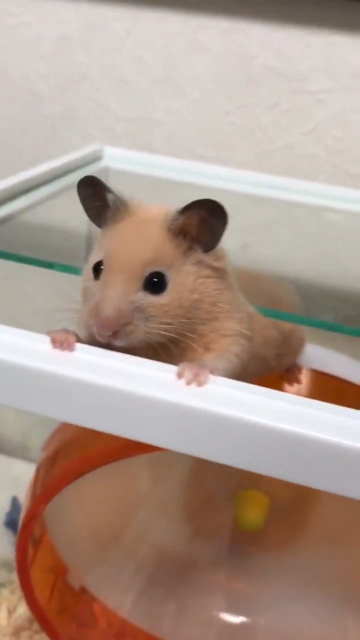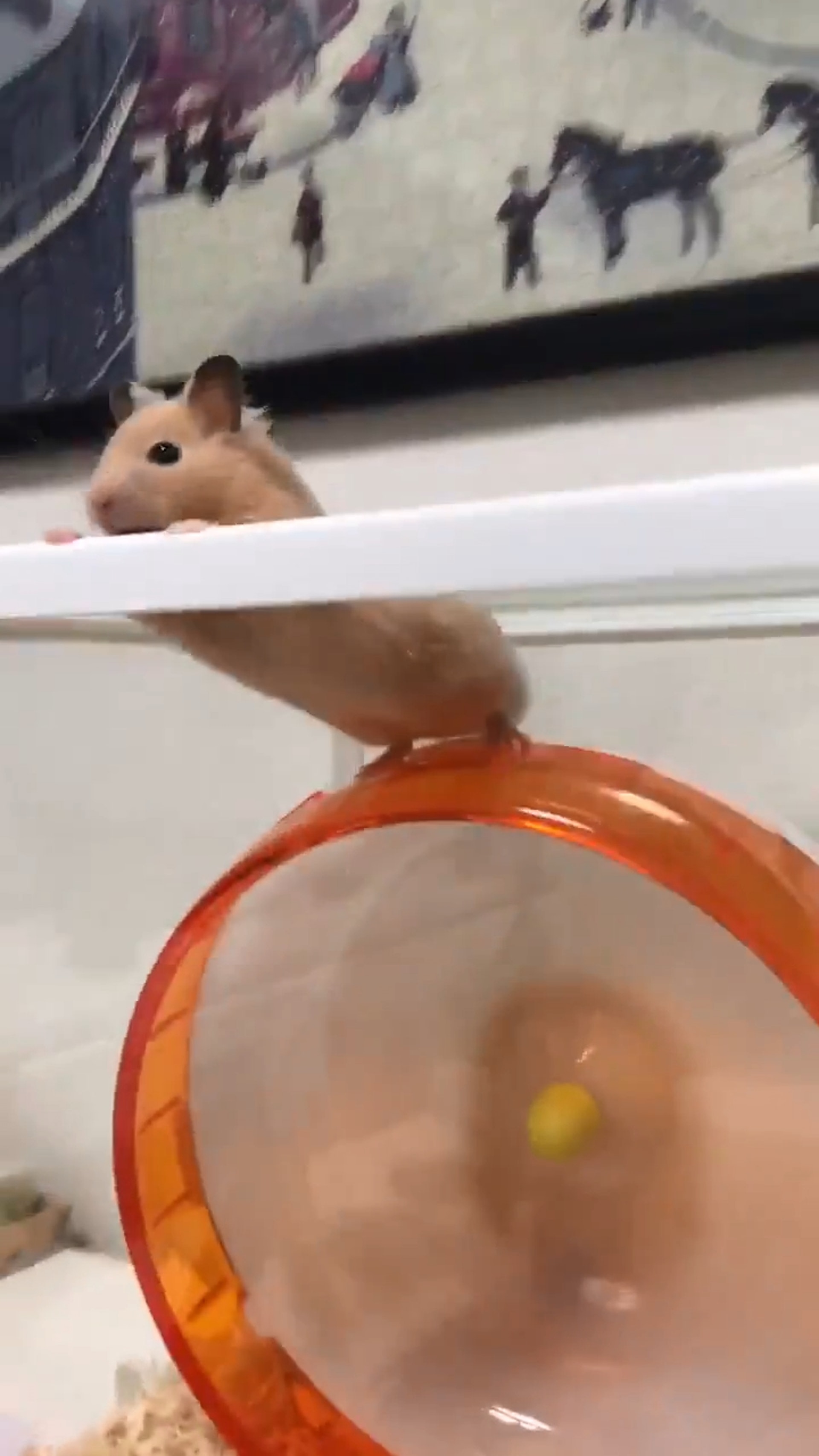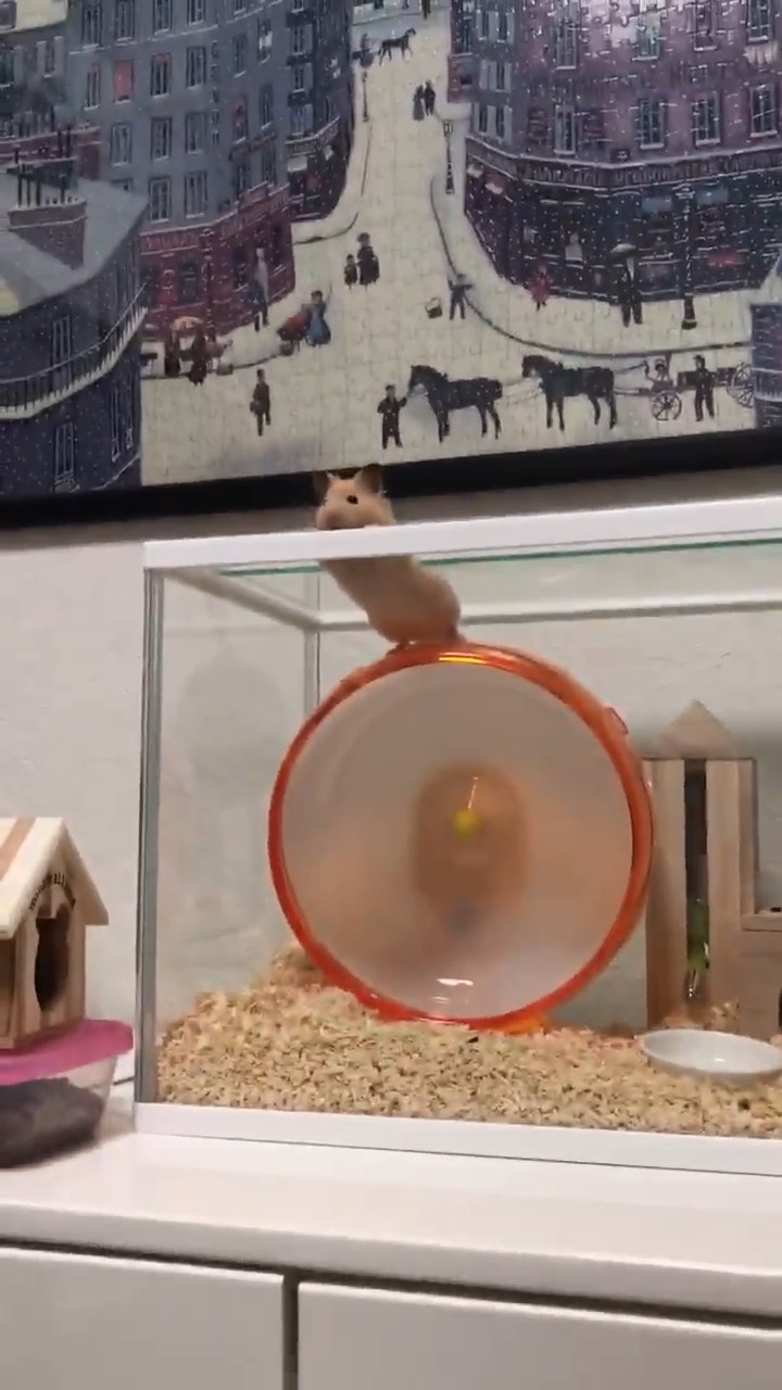 ▼主人走到倉鼠籠前發現「雞屁屁君」前腳扒住籠子邊緣,後腳蹬住跑步滾輪的頂部,整個身子被拉成「超長版」: