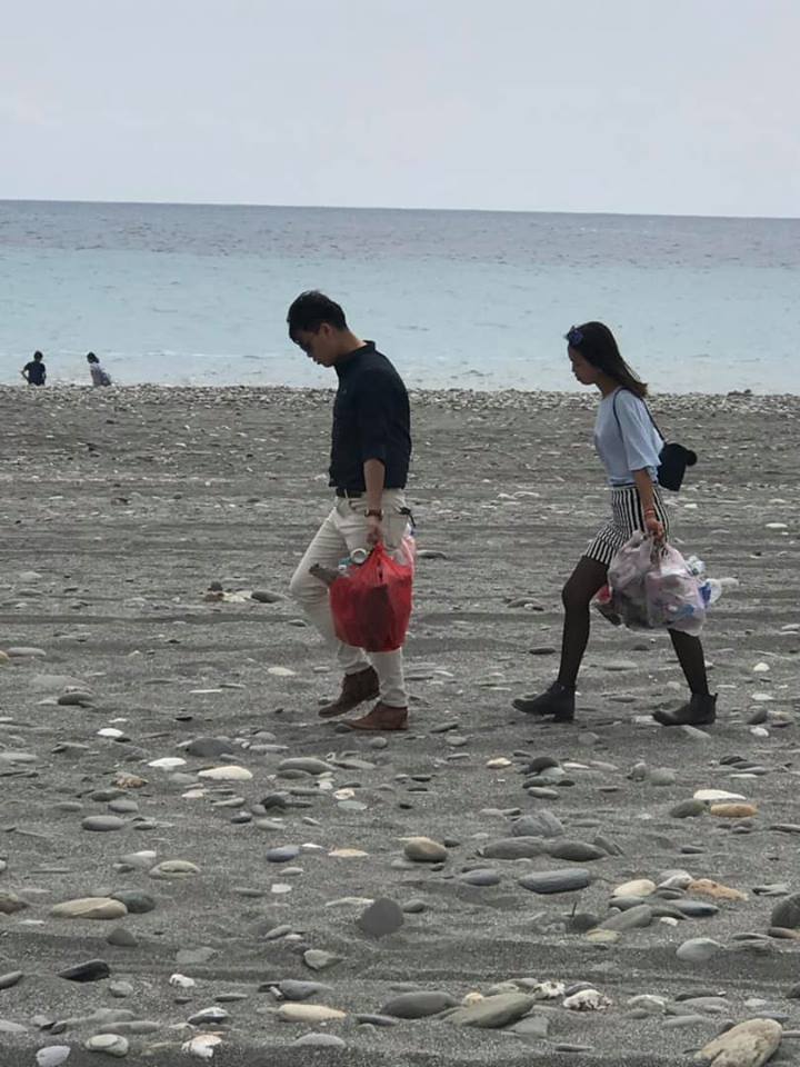 ▼原來有一對年輕的情侶從遠處走來,兩人都各提了兩個塑膠垃圾袋,裡面都是各種被任意丟棄在沙灘上的寶特瓶、鋁罐等垃圾,看來是海邊撿完垃圾準備離去。這一幕讓林洋志仍不住拿起了手機拍下這令人感動的畫面,上傳到《就是礙台東》後,不到一天就獲得了超過2000個讃,也有許多網友紛紛留言感謝他們對於環境的愛護!
