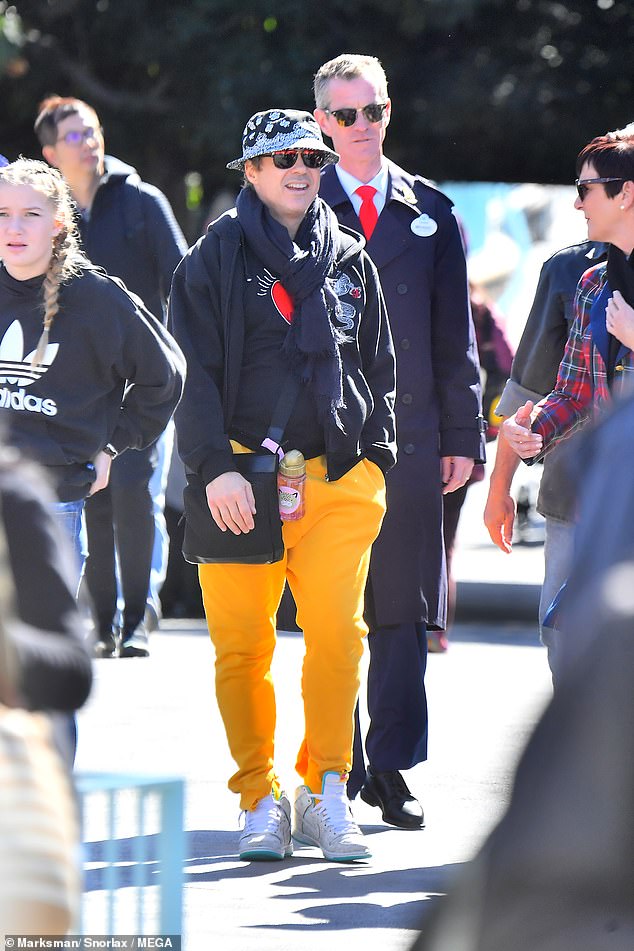 ▼​當天小勞勃道尼戴著漁夫帽,身穿黑色上衣、亮黃色褲子,還搭配黑色大圍巾、墨鏡和斜背的黑色側背包,整體穿搭非常隨意。
