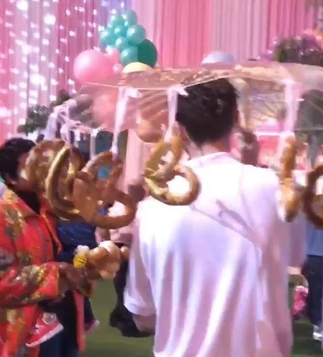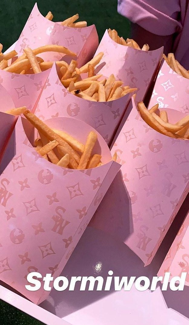 ▼派對上的食物也很特別。亮晶晶的遮陽傘下掛著椒鹽脆餅,薯條、披薩則裝在粉紅色的LV紙盒裡。