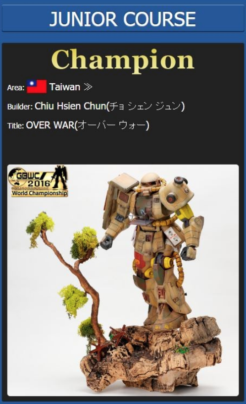 當時只有13歲的國二生邱顯鈞,因為看了朋友的鋼彈型錄而從此愛上鋼彈。他的熱愛甚至讓他對製作模型產生濃厚的興趣,甚至參加比賽一路從台灣分區冠軍贏到日本總決賽,以作品《Over War》奪下青少年組世界冠軍引轟動!