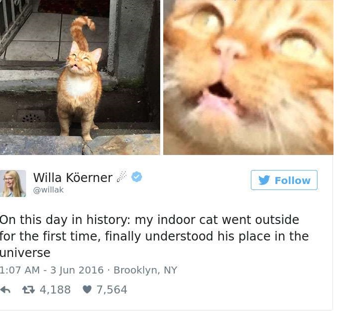 ▼「我家貓第一次出門,終於知道了自己對整個宇宙來說意味著什麼。」