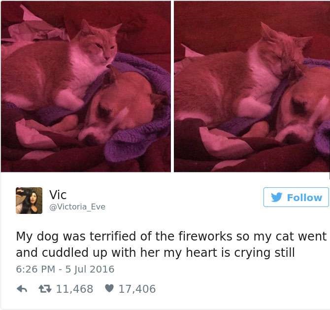 ▼「我家狗被煙火嚇到了,貓咪過來給了牠一個擁抱。」