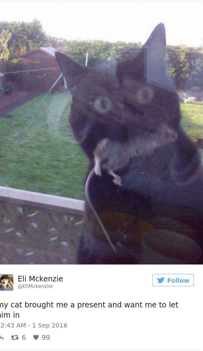 ▼「我家貓咪想讓我放牠進來,還給我帶了一份禮物。」