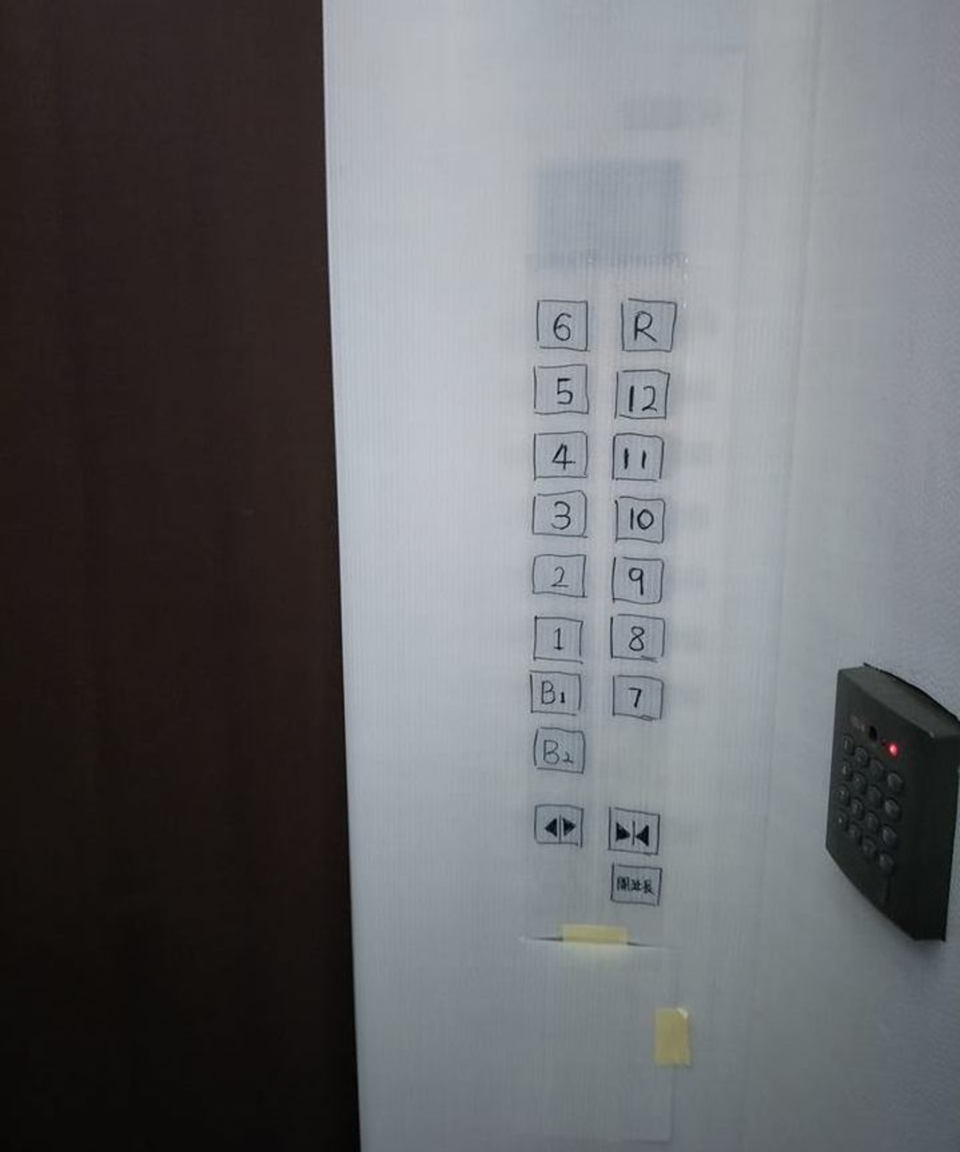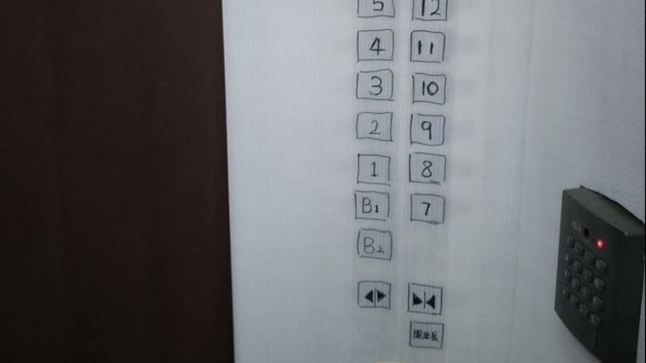 ▼網友所在的公寓有人家裝潢,電梯中被貼滿裝潢保護膜。貼心的裝潢師傅為了不影響大家使用電梯,還親自用奇異筆畫出了各個按鈕的位置,認真的寫上樓層數字,還特意露出感應器的位置。