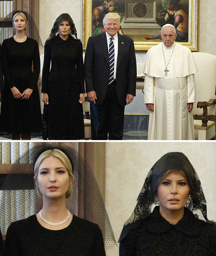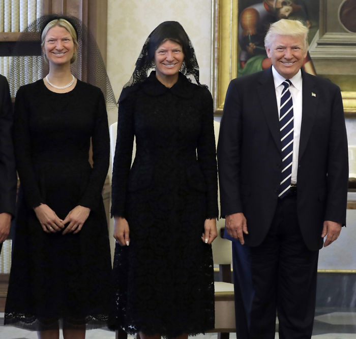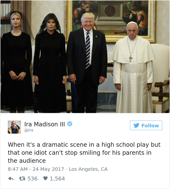 ▼這張圖仿佛教宗在帶領川普夫婦參觀房間:「這裡有椅子、地板、牆壁… 沒了,你可以走了!」