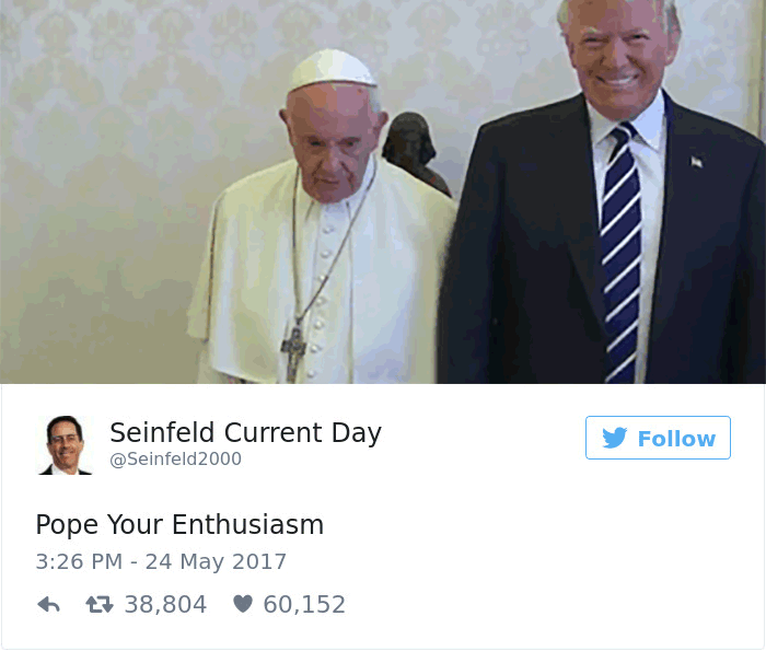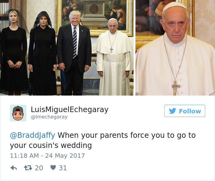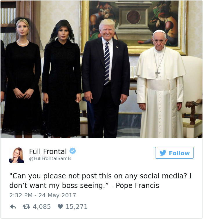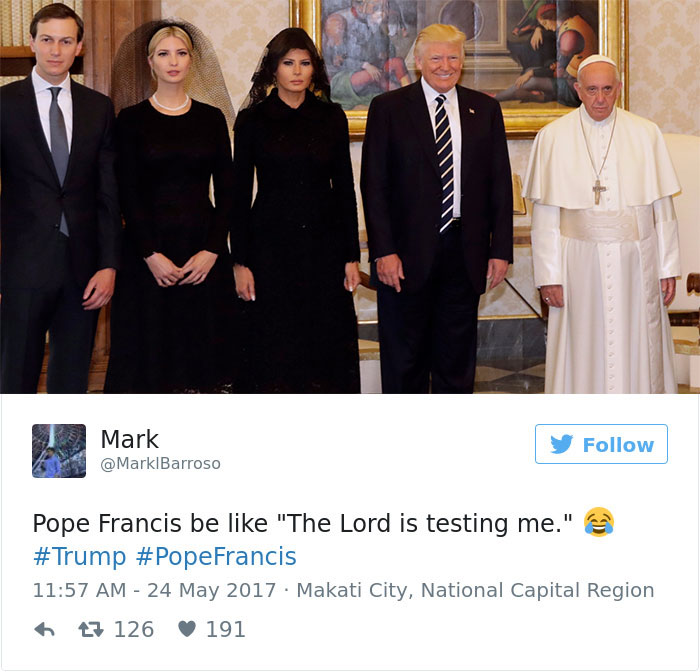 2019年02月20日美國總統川普曾經2017年前往拜訪教宗,不過兩人在會面時一張照片卻引起了熱烈的討論,兩人在會面時原本相談甚歡,不過在大合照時,教宗的表情卻說明了一切。網友在看到這張照片之後,直接開啟了一波「PS大賽」和各種神詮釋,一起來欣賞網友們的創意吧!