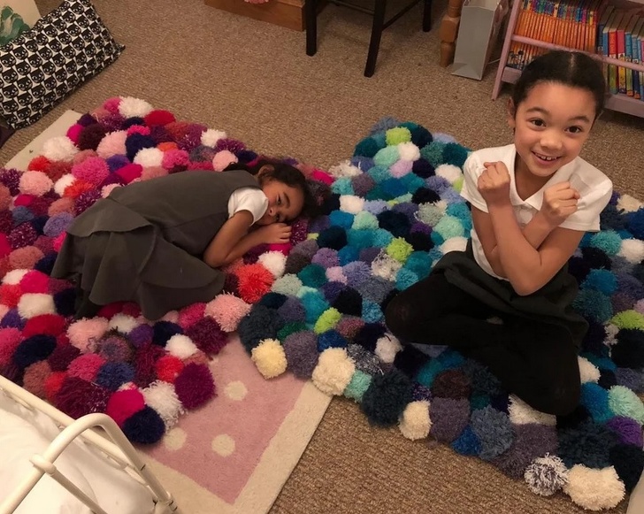 ▼阿嬤為兩個孫女做了她們喜歡顏色的毛毛坐墊。