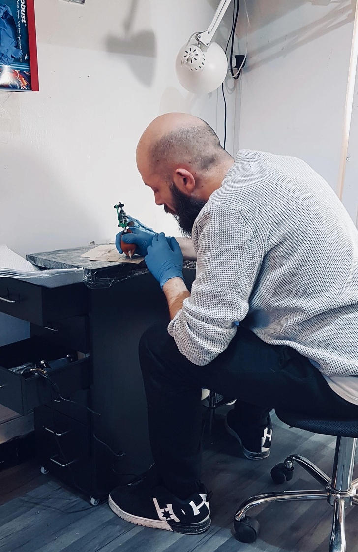 ▼經過8個月的訓練,今天我終於在師傅的批准下開始在假皮上學刺青了!