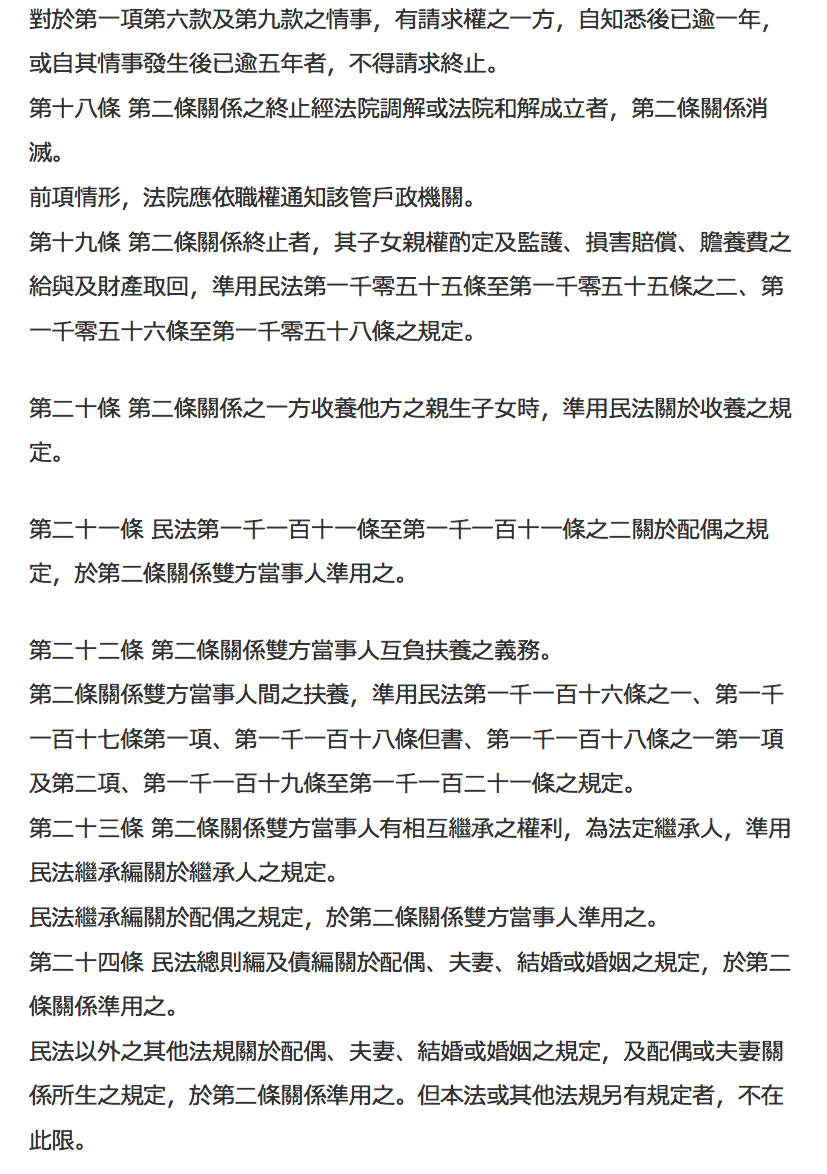▼兩人也可以繼承財產並繼親收養,還有其他關於夫妻、配偶的權利義務也都允許一併準用。