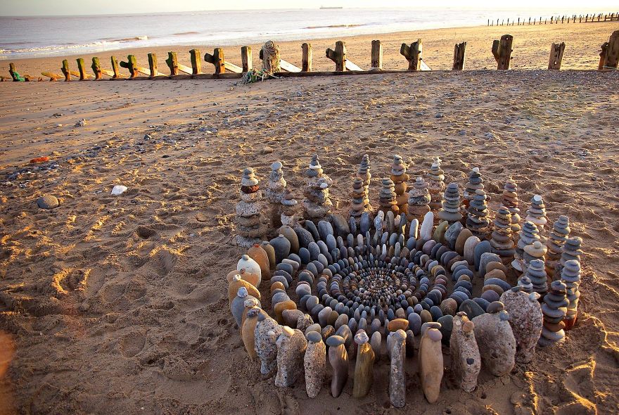 ▼英國約克郡的藝術家詹姆斯.布蘭特(James Brunt),就擅長就地取材,將樹葉、貝殼、石頭等都拿來當作他的創作材料,並且直接在野外創作;也因此,他的作品可能會被風、雨和海浪等自然現象摧毀,美好稍縱即逝。