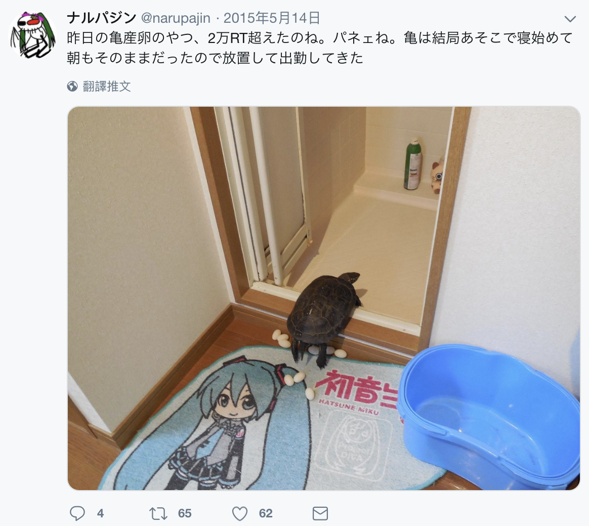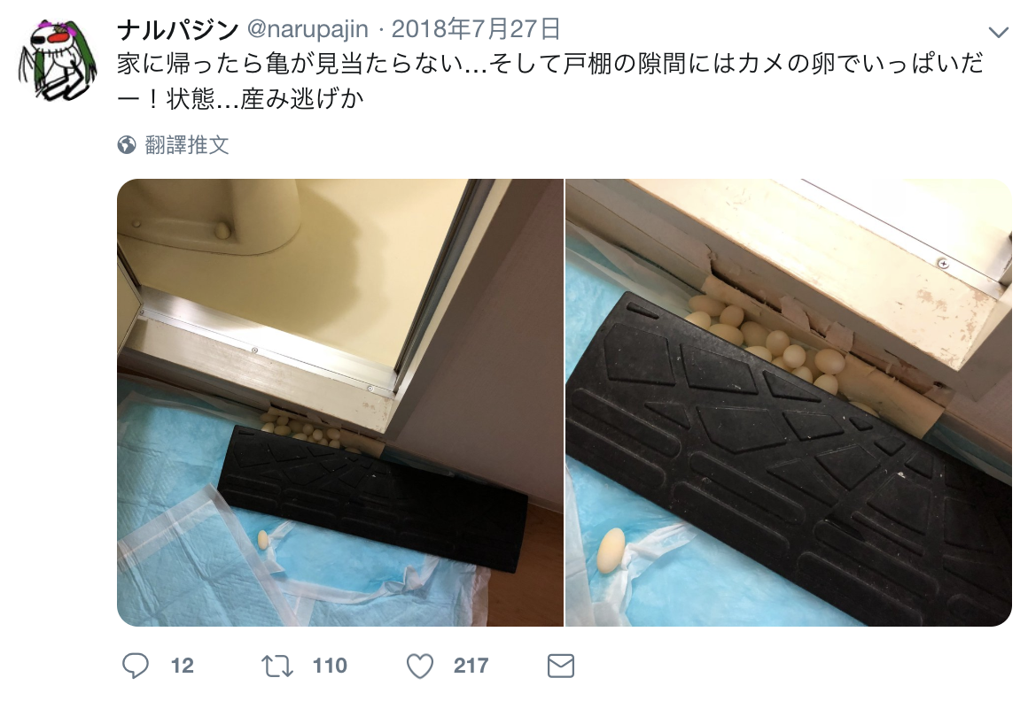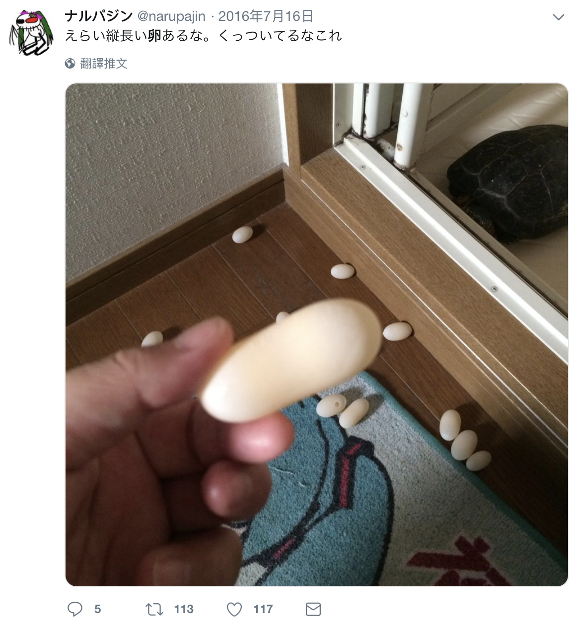 在推特上有位日本網友,因為想飼養寵物,但平時需要上班,沒有太多時間能陪伴貓狗,所以最後養了一隻烏龜,不定時會在推特更新寵物龜的日誌。烏龜產卵期大約在5月至9月,推主ナルパジン(@narupajin)每年都會記錄寵物龜產卵的事情。