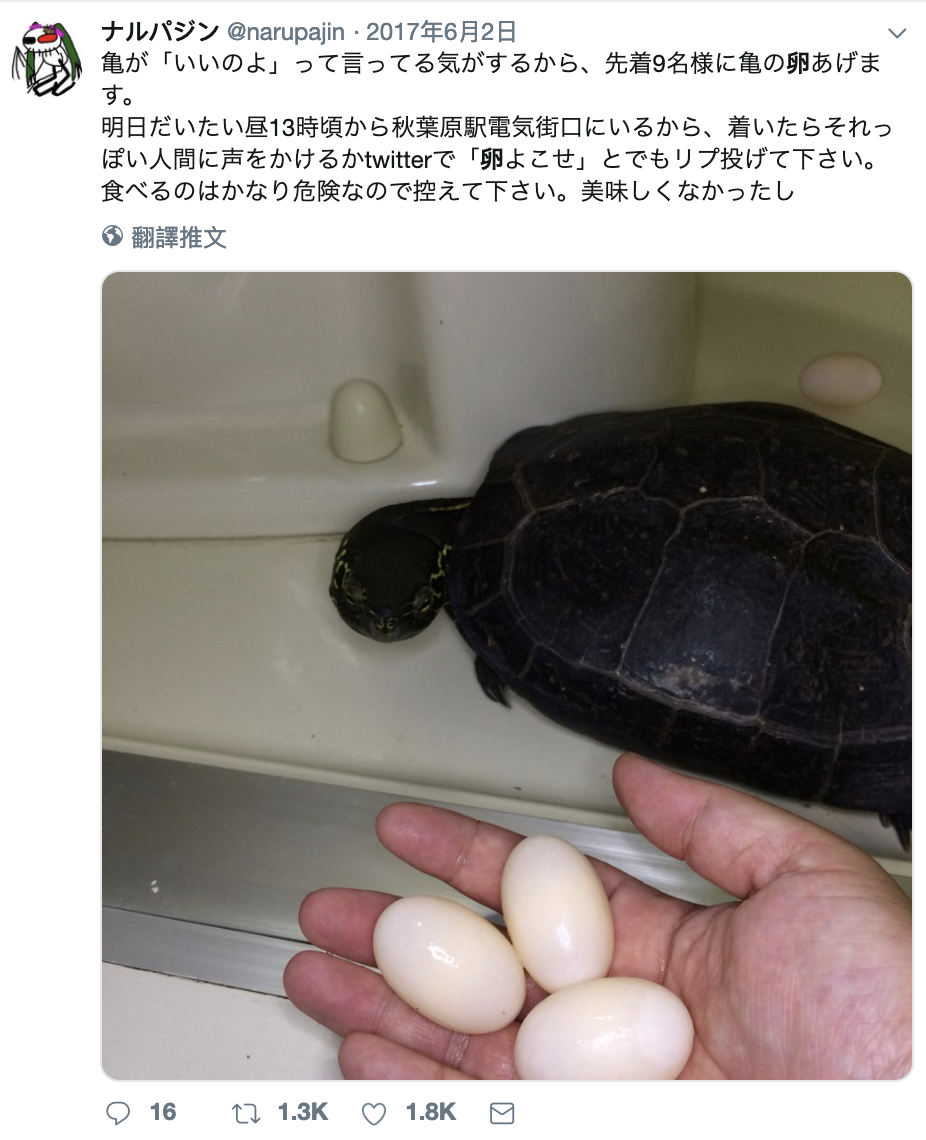 ▼2017年「徵得了烏龜的同意後,我決定送出烏龜蛋給九個人,先到先贏。明天大概下午一點左右,我會在秋葉原車站的電器街口,大家到場的話就跟看起來長得像我的人搭話,或是在推特上回應『把蛋給我拿來』。吃這個可能會發生問題,請想要做傻事的人克制一下,何況也不好吃。」 看來大家實在對龜蛋太好奇了,推主在2017年還贈送龜蛋(・ω・)