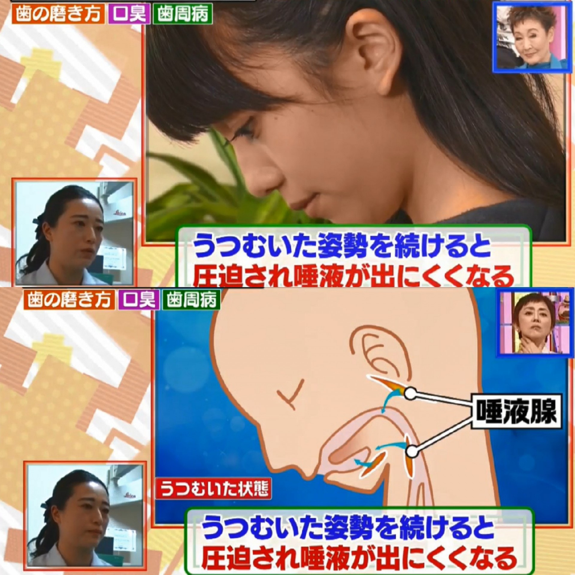▼原來人低著頭的姿勢,會壓著人體內的唾液腺,令唾液較難分泌,導致無法帶走口腔內的細菌,進而造成口臭。